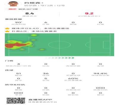 蓝军能保持零封离不开门将约根森的优异表现,他本场比赛贡献6次扑救,力保城门不失,同时获评8.4分全场最高。