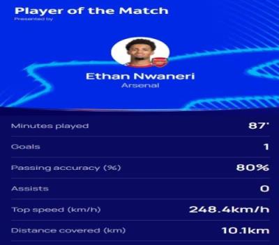 据欧足联官网显示,阿森纳17岁小将恩瓦内里当选全场最佳,本场比赛他首发出战87分钟,打入一球,传球成功率80%,跑动距离10.1km。