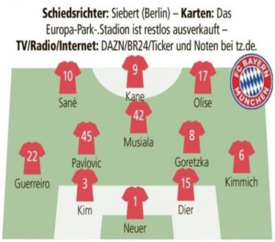 体育资讯1月25日报道宣称 拜仁将在明日德甲对阵弗赖堡,在后防多人伤停的情况下,德媒《慕尼黑日报》预测了拜仁首发。
