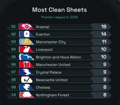 2024年英超零封榜:阿森纳18场居首,埃弗顿14场第二&曼城11场