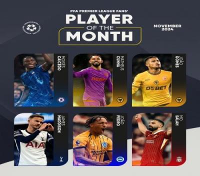 体育资讯12月3日报道宣称 PFA(英格兰职业球员工会)公布了球迷票选英超11月最佳球员的候选名单,萨拉赫、麦迪逊、凯塞多在列。