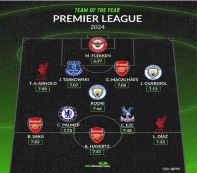 体育资讯1月1日报道宣称 WhoScored排出了英超2024年最佳阵容,罗德里、哈弗茨、帕尔默、萨卡在列。