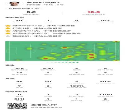 索博本场1球+5关键传球+2造良机3成功长传3抢断9.2分全场最高