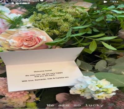 京多安的妻子萨拉更新社媒,晒出了B席一家人以及曼城全队赠送的鲜花,在贺卡上写着“欢迎回家,我们想念你们,我们很高兴你们回来了。”