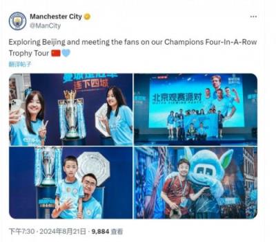 曼城冠军奖杯行8月17日到8月18日在北京进行,曼城官方账号在社交媒体上晒出活动的照片,并写道:“在我们的四连冠巡回之旅中探索北京,并与球迷们见面。”