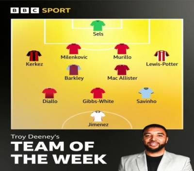 后卫:米洛什(伯恩茅斯)、米伦科维奇(诺丁汉森林)、穆里略(诺丁汉森林)、刘易斯-波特(布伦特福德)