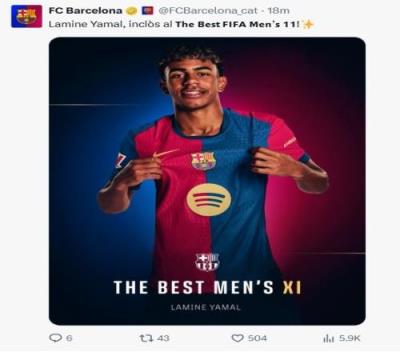巴萨官方晒照,祝贺亚马尔入围FIFA最佳阵&邦马蒂获女足最佳球员