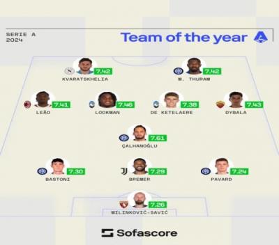 中场:莱奥(米兰,7.41分)、卢克曼(亚特兰大,7.46分)、恰尔汗奥卢(国米,7.61分)、德凯特拉雷(亚特兰大,7.38分)、迪巴拉(罗马,7.43分)
