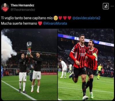 特奥社媒配文写道:“我是如此爱你,我的队长卡拉布里亚,也祝我的兄弟莫拉塔未来好运!”