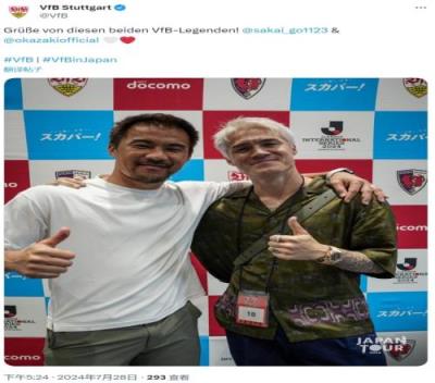 斯图加特官方账号在社交媒体上晒出冈崎慎司、酒井高德的合照,并写道:“来自两位斯图加特传奇人物的问候!”
