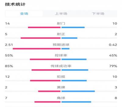 曼联10富勒姆数据:射门1410,射正52,预期进球2.510.42