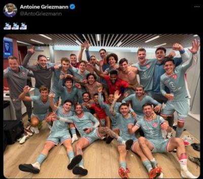 体育资讯12月22日报道宣称 在刚刚结束的西甲联赛中,马竞客场2-1绝杀逆转巴萨,格列兹曼在赛后晒出了球队更衣室内的庆祝照。