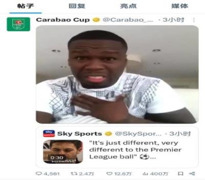 联赛杯官方社媒转发了阿尔特塔接受采访的视频,并且用美国说唱巨星50 Cent的表情包回应了阿尔特塔,50 Cent当时说的话是:“你为啥***要这么说我?(Why you say f*** me for?)”