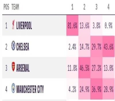 由于阿森纳和曼城本轮双双丢分,利物浦的夺冠概率已经高达81.6%。