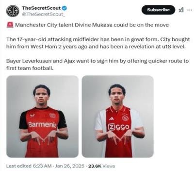体育资讯1月26日报道宣称 英媒TheSecretScout消息,勒沃库森和阿贾克斯希望签下曼城17岁进攻型中场穆卡萨。