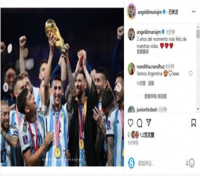 体育资讯12月18日报道宣称 迪马利亚更新社媒动态,纪念阿根廷队赢得卡塔尔世界杯冠军两周年。