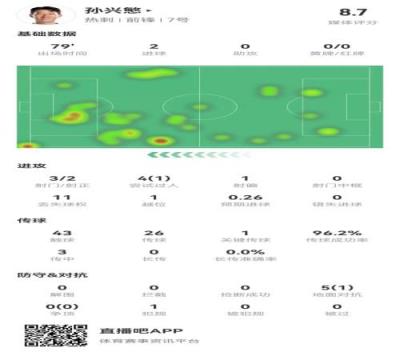 体育资讯1月24日报道宣称 热刺在本轮欧联杯3-2领先霍芬海姆,孙兴慜本场数据如下: