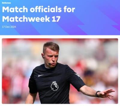 体育资讯12月17日报道宣称 英超官方公布第17轮联赛各场执法裁判,萨姆-巴罗特(上图)执法热刺vs利物浦,VAR蒂尔尼;班克斯执法维拉曼城,西蒙-胡珀执法水晶宫vs阿森纳。