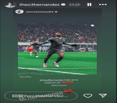 莱奥晒出了自己进球后的庆祝照,还在配文中戳了庆祝照中的特奥,他写道:“很高兴看到你像这样庆祝❤️Vamos(前进)!”