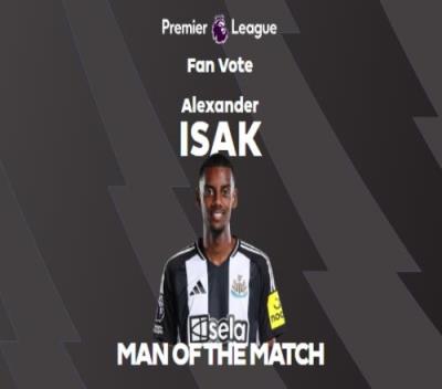 体育资讯12月15日报道宣称 英超第16轮比赛中,纽卡斯尔4-0完胜莱斯特城。赛后,传射建功的伊萨克当选了全场最佳球员。