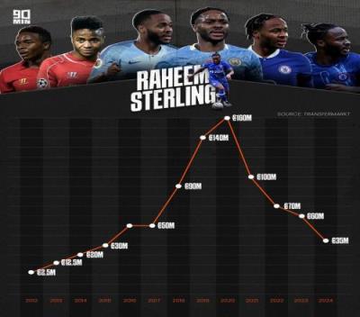 体育资讯08月20日报道宣 斯特林与切尔西矛盾近日浮上台面,而这位曾经的1.6亿欧前锋,现身价仅3500万欧。
