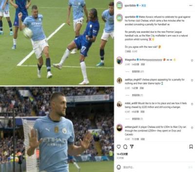 媒体sport bible发文写道:科瓦西奇拒绝对老东家庆祝进球,几分钟前他避免了手球被判点球。