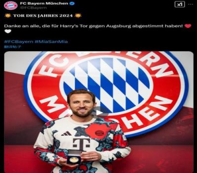 共计超过28万人参与投票,凯恩在11月对阵奥格斯堡的进球获得了约94000票,获得投票率达33.11%,也得以赢得了这一奖项。