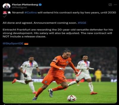 记者:法兰克福将与20岁后卫柯林斯续约至2030年,无解约金条款
