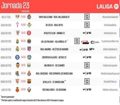 体育资讯1月21日报道宣称 西甲官方公布了第23轮比赛的开球时间,皇马vs马竞2月9日4点,塞维利亚vs巴萨2月10日4点。