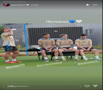 体育资讯11月17日报道宣称 阿根廷边锋加纳乔更新社媒动态,晒出与国家队队友的合照。