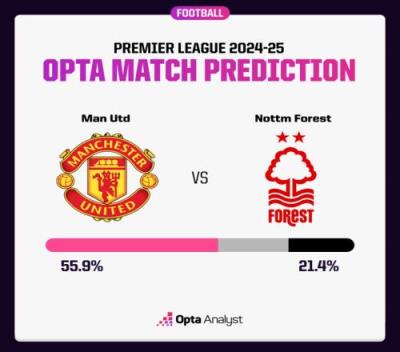OPTA预测曼联vs森林胜率:曼联赢球概率55.9%,森林赢21.4%