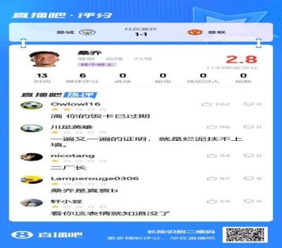 曼联边锋桑乔迎来回归球队后的首场正式比赛,在比赛中替补出场13分钟,还在点球大战中罚丢了关键点球。赛后桑乔仅获体育资讯吧友2.8评分。