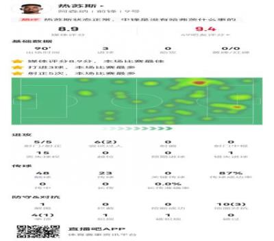 热苏斯本场5射5正进3球+1失良机14对抗4成功获评8.9分最高