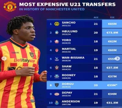 体育资讯2月2日报道宣称 曼联已经官宣从莱切引进翼卫多古,《转会市场》也统计了曼联队史U21球员引援榜。