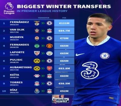 体育资讯1月14日报道宣称 今年的冬季转会窗口已经开启,德国转会市场统计了英超历史上冬窗最贵引援排行榜。其中,1.21亿欧的恩佐成为了英超冬窗标王。