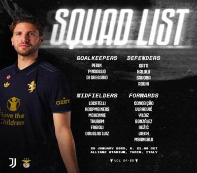 体育资讯1月29日报道宣称 北京时间1月30日凌晨4:00,欧冠联赛阶段第8轮,尤文图斯将坐镇主场迎战本菲卡。赛前,尤文官方公布了本场比赛球队的大名单,弗拉霍维奇领衔锋线,小孔塞桑&伊尔迪兹在列,后卫线仅4人。