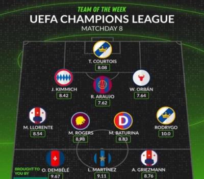 whoscored欧冠第8轮最佳阵:登贝莱、劳塔罗领衔,罗德里戈在列