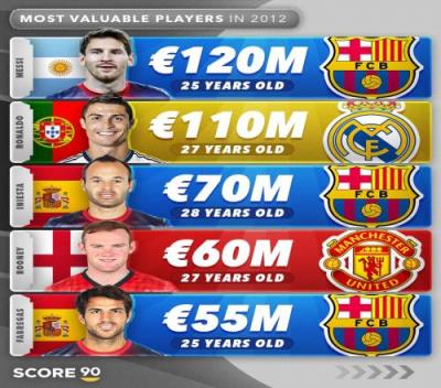 2012年身价前五球员:梅西1.2亿第1,C罗1.1亿欧第2,小白第3