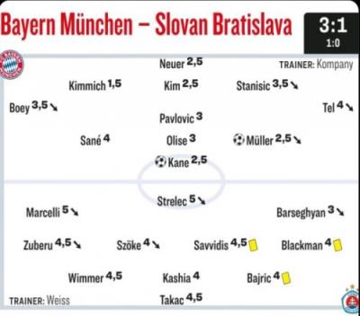 博伊 3.5分,萨内 4分,帕夫洛维奇 3分,奥利斯 3分,穆勒 2.5分,特尔 4分