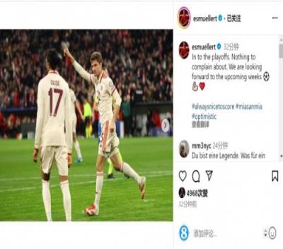 穆勒在社交媒体上晒出比赛照片,配文:“进入附加赛,没有什么好抱怨的。我们期待接下来几周的比赛。”