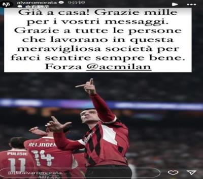 目前,莫拉塔更新了社媒:“已经到家了!非常感谢大家的留言,感谢所有在这家俱乐部工作的人,你们总是让我们感觉很好,加油米兰。”