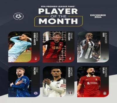 体育资讯1月9日报道宣称 PFA(英格兰职业球员工会)公布了英超12月最佳球员的候选名单,萨拉赫、帕尔默、伊萨克等球员入选。