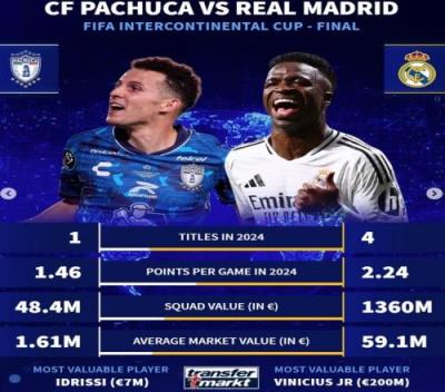 体育资讯12月19日报道宣称 欧冠冠军皇马在今日洲际杯决赛对阵中北美冠军帕丘卡,《转会市场》也对比了双方情况。