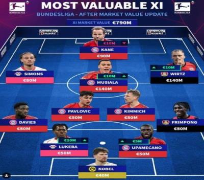 德转列德甲最贵阵:穆西亚拉领衔拜仁6将,维尔茨、西蒙斯在列