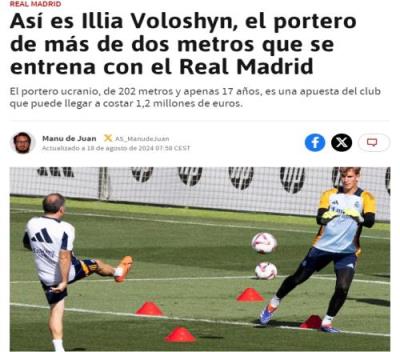 阿斯报:皇马梯队门将本周六随一线队训练,年仅17岁身高2.02米