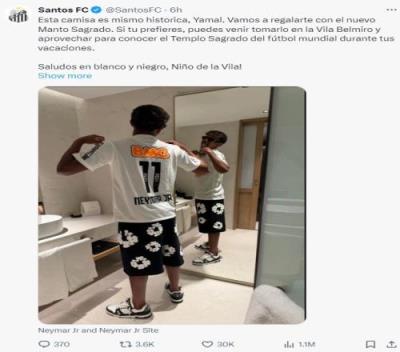 亚马尔身穿内马尔的桑托斯球衣!桑托斯官方:我们希望你来参观