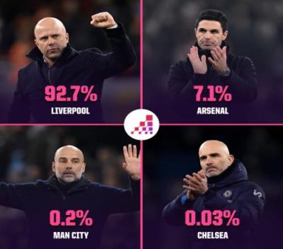 体育资讯1月26日报道宣称 在英超第23轮部分比赛完赛后,Opta更新了本赛季英超的夺冠概率,利物浦升至了92.7%。
