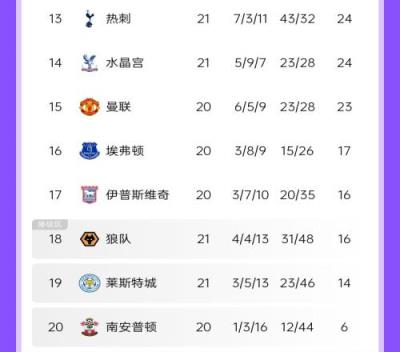 目前在积分榜上,本赛季的3支升班马都要为保级而战,且情况都不太乐观。南安普顿在20轮比赛中只拿到了6分,莱斯特城经历了一波6连败,积14分排在第19;伊普斯维奇暂时以净胜球优势排在第17位。