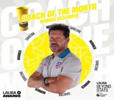 西甲官方社媒晒出为西蒙尼制作的海报,宣布他当选12月最佳教练。