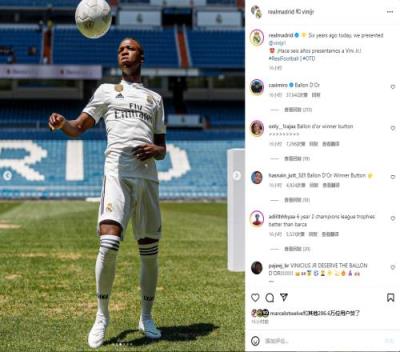 皇马官方账号在社交媒体上晒出维尼修斯亮相时颠球的照片,并配文:“6年前的今天,维尼修斯在皇马亮相。”